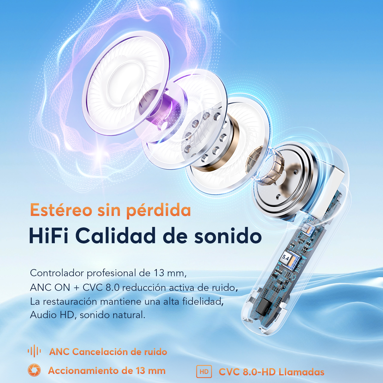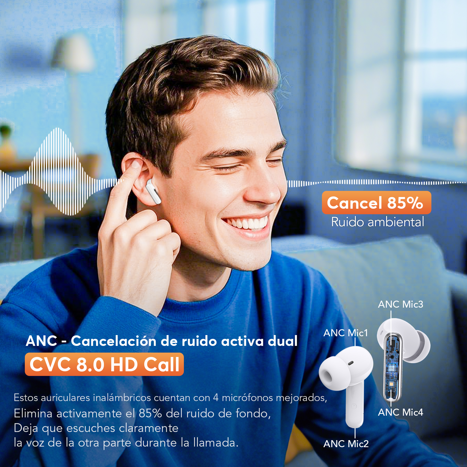- Tecnología de cancelación de ruido dual ANC y CVC: nuestros auriculares inalámbricos están equipados con dos controladores dinámicos compuestos de baja distorsión de 13 mm y un decodificador de alta resolución incorporado para elevar su experiencia auditiva a un nivel extraordinario. La cancelación activa de ruido (ANC) avanzada te rodea en un mar de sonido puro, mientras que el algoritmo CVC 8.0 integrado garantiza llamadas claras incluso en los entornos más ruidosos.