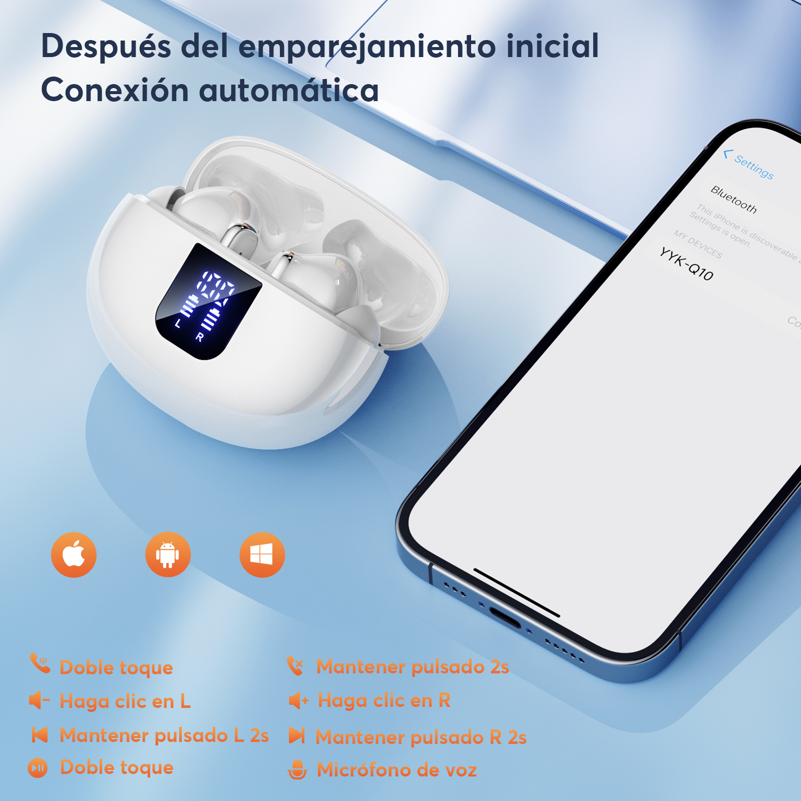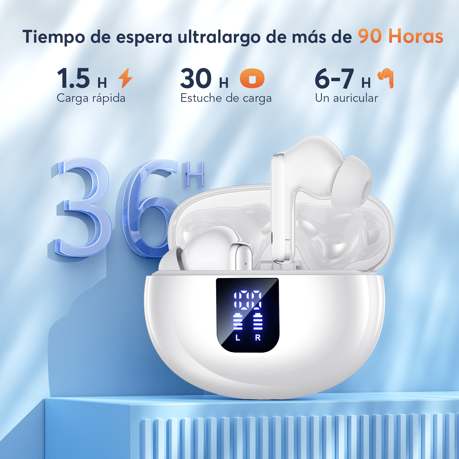 - 46 horas de reproducción, entretenimiento ininterrumpido: Nuestros auriculares Bluetooth ofrecen de 6 a 7 horas de reproducción continua con una sola carga, asegurando que tu música o llamadas te acompañen durante todo el día. ¡Con el elegante estuche de carga, amplía tu experiencia auditiva a un total de 46 horas! ¿Necesitas recargarlos rápidamente? Con solo 1 hora de carga, los auriculares se recargan por completo, recuperando tu ritmo en un instante. Perfectos para viajes largos, entrenamientos o desplazamientos diarios