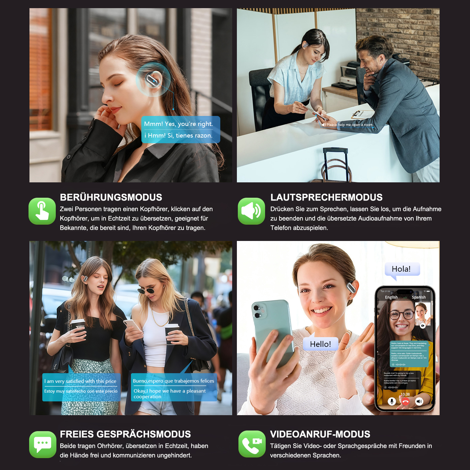 Sprechen Sie mit den AI-Übersetzer-Kopfhörer die Welt an! – Keine Sprachbarrieren mehr – unsere intelligenten Übersetzungs-Ohrhörer unterstützen Echtzeitübersetzungen in mehreren Sprachen. Egal, ob Sie reisen, internationale Geschäfte tätigen oder neue Freunde im Ausland gewinnen, verbinden Sie einfach die App und sprechen Sie frei. Mit kristallklarem Klang in AI-HD, langer Akkulaufzeit und nahtloser App-Integration sind diese Ohrhörer gleichzeitig Ihr Musikbegleiter und persönlicher Dolmetscher.