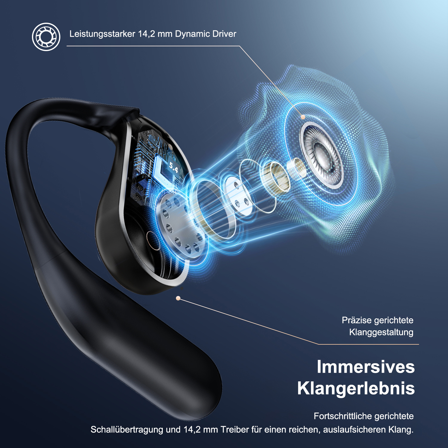 Ergonomisches Open Ear Design: Unsere Open Ear Kopfhörer bieten maximalen Komfort, sodass Sie sie stundenlang tragen können, ohne Ermüdung zu spüren. Perfekt für Brillenträger, ermöglichen diese kabellosen Ohrhörer Ihnen, Ihre Umgebung zu hören, während Sie gleichzeitig hochwertigen Klang genießen.