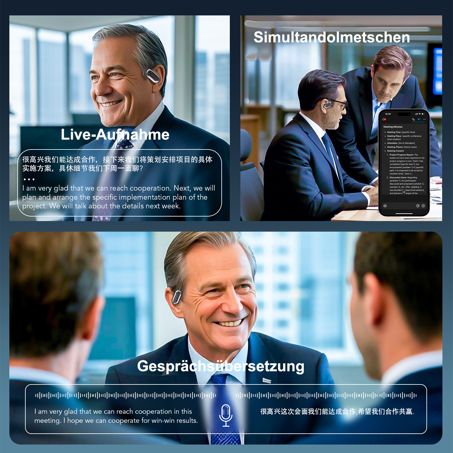 4-in-1 Übersetzer Kopfhörer: Erleben Sie Echtzeitübersetzungen in 198 Sprachen mit intelligenten Ohrhörern, die Übersetzung, Musik, Anrufe und Besprechungsprotokolle in einem eleganten Gerät vereinen. Angetrieben von fortschrittlicher AI ermöglichen sie es Ihnen, mühelos zu sprechen, zuzuhören und sich zu verbinden – egal, ob Sie reisen, an globalen Meetings teilnehmen, neue internationale Freunde finden oder im Ausland studieren.